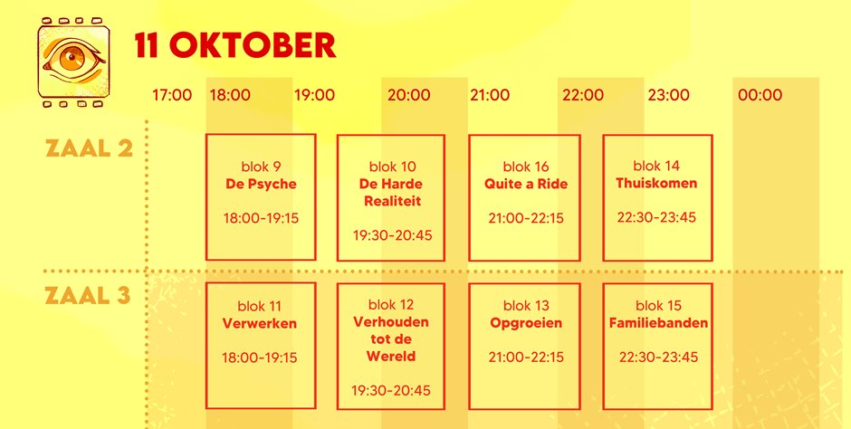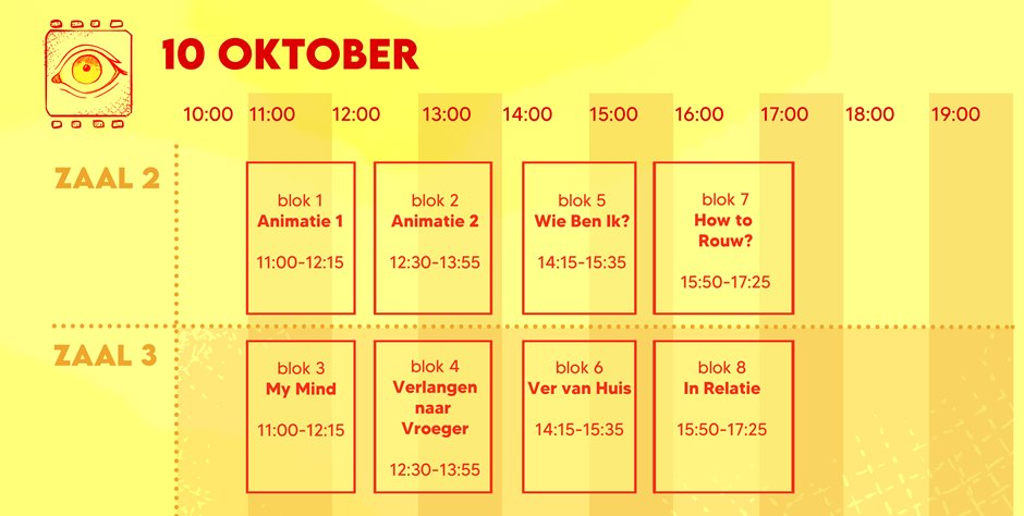 Benieuwd welke films er allemaal te zien zijn? Bekijk hieronder alle films per blok.Maandag 10 oktober------------Dinsdag 11 oktober