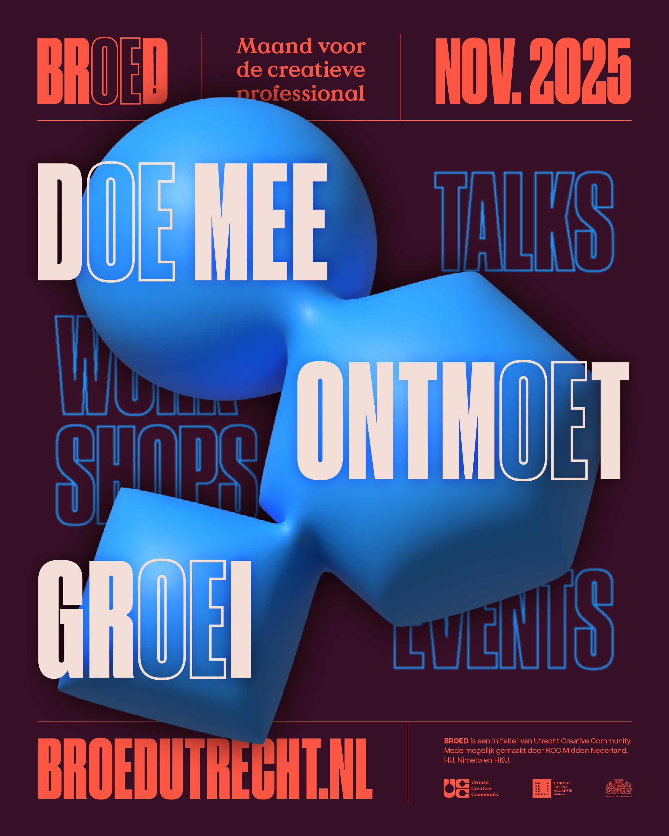 Met BROED wil Utrecht Creative Community professionalisering van de creatieve en culturele sector in de regio Utrecht toegankelijker maken en versterken. BROED stimuleert creatieven om even uit hun hoofd te stappen, het veld in. Want blijven leren en ontwikkelen is belangrijk voor jezelf en je werk. Juist wanneer je druk bent, geen tijd hebt of niet precies weet wat je wilt.