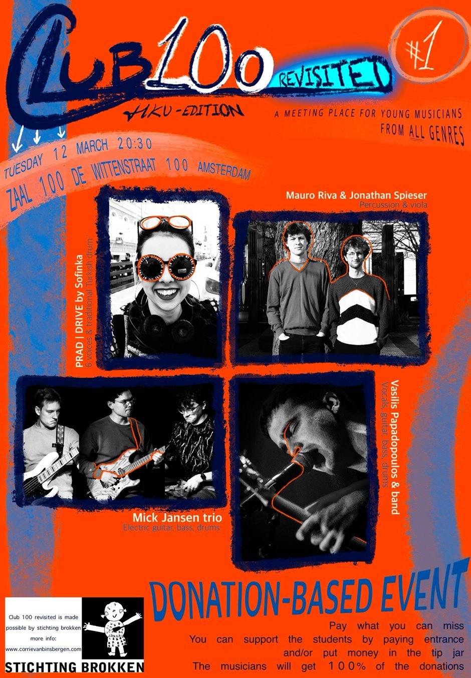 Sinds seizoen 16/17 bestaat het jaarlijkse CLUB 100 3.0 evenement, gelinkt aan de opleiding Musician 3.0. Na een korte onderbreking is CLUB 100 terug van weggeweest. Dit keer met jong talent van alle verschillende afdelingen van de HKU Utrechts Conservatorium.dinsdag 12 maart #1: