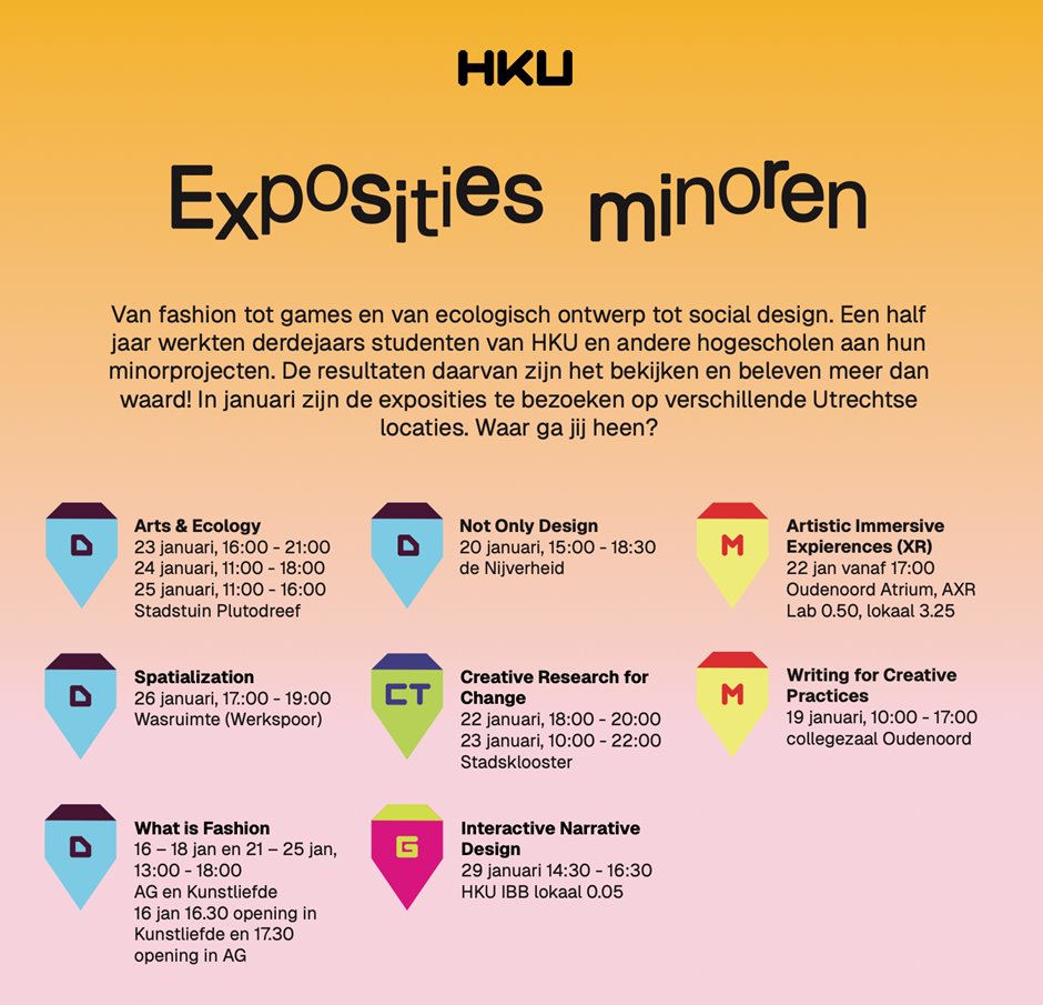 Van fashion tot ecologisch ontwerp en van games tot social design: derdejaars studenten van HKU en andere hogescholen werkten een half jaar aan hun minorproject. Of je nu naar het Stadsklooster, de Nijverheid, AG, het Werkspoor of ‘gewoon’ naar Oudenoord of IBB gaat: dit eindwerk is het zien en beleven waard!