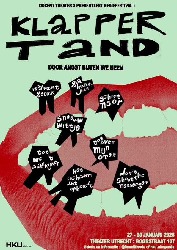De voorstellingen spelen van dinsdag 27 januari t/m vrijdag 30 januari in Studio 3 en de Koepelzaal van Theater Utrecht (Boorstraat 107). Volg Docent Theater op instagram: Bam dit is EDU!