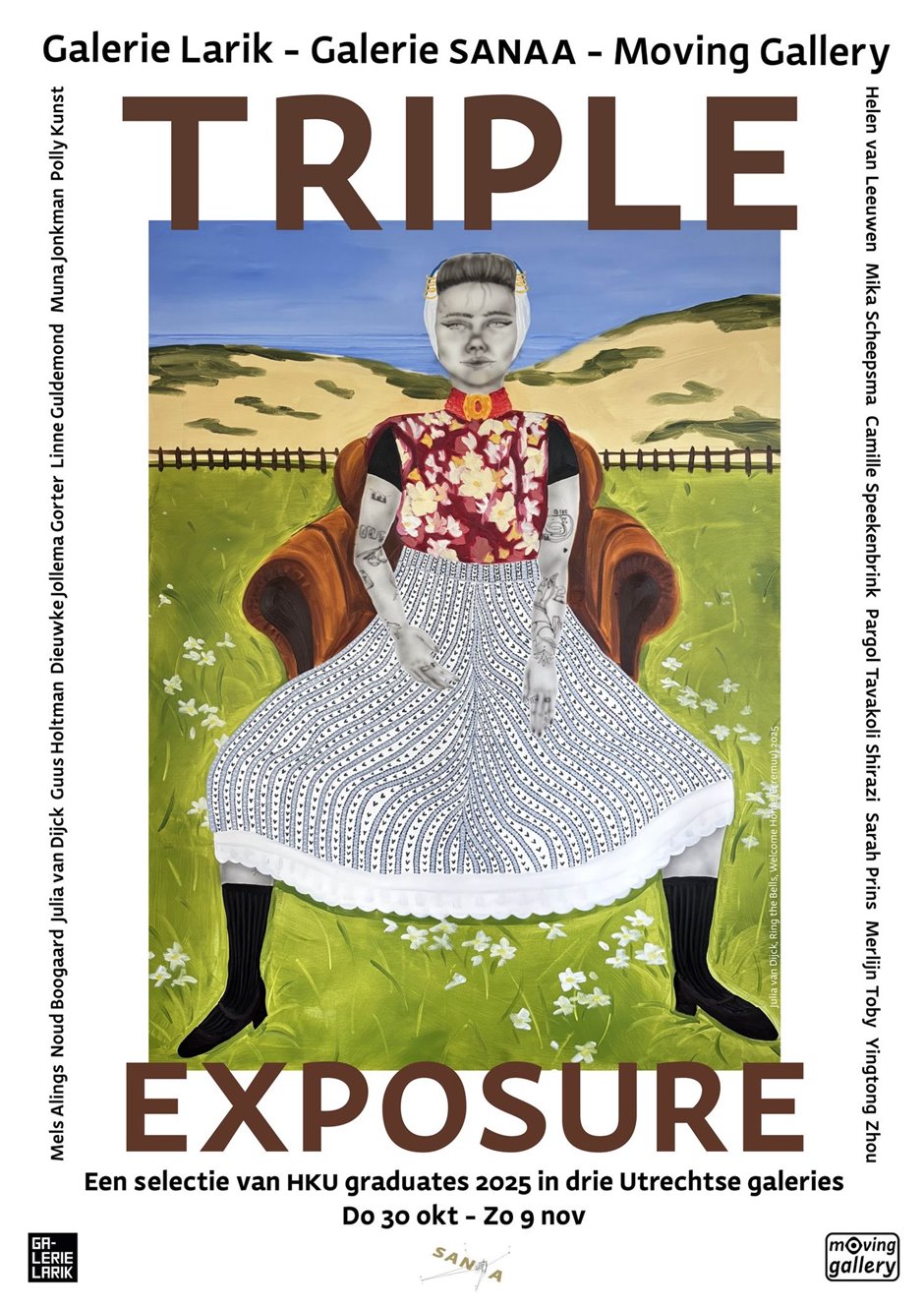 De expositie wordt op 30 oktober om 16.30 geopend in Galerie SANAA door Myrthe van de Giessen (directeur HKU Beeldende Kunst), gaat verder om 17:15 in Galerie Larik en wordt rond 18:00 uur feestelijk afgesloten in de Moving Gallery.Triple Exposure is t/m 9 november van woensdag t/m zondag van 12.00-17.30 uur in alle drie de galeries te bezoeken.