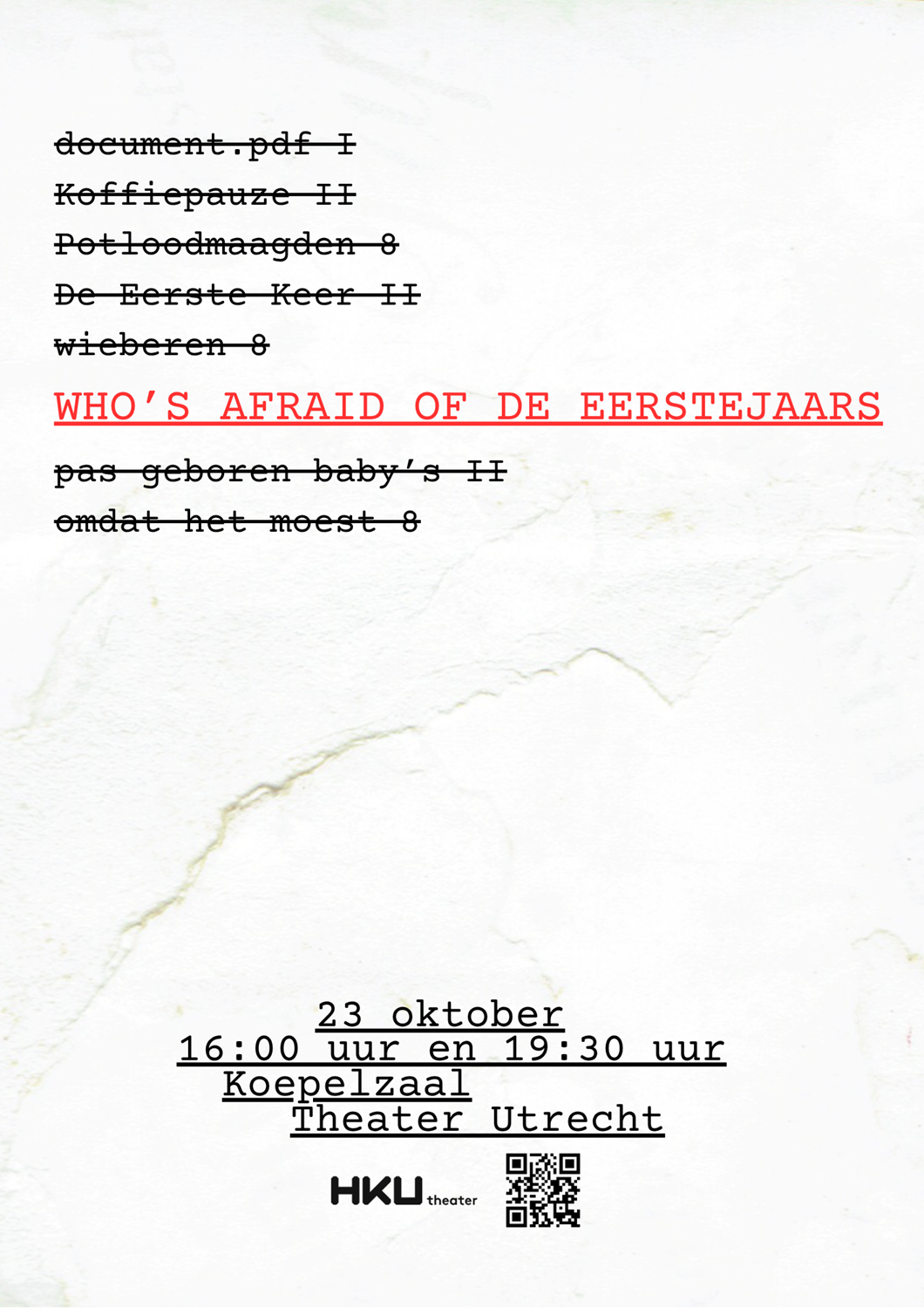 De eerstejaars Writing for Performance presenteren hun werk. Een ontmoeting met nieuwe makers, nieuwe stemmen, nieuwe verhalen. Vers, ongepolijst en verrassend.