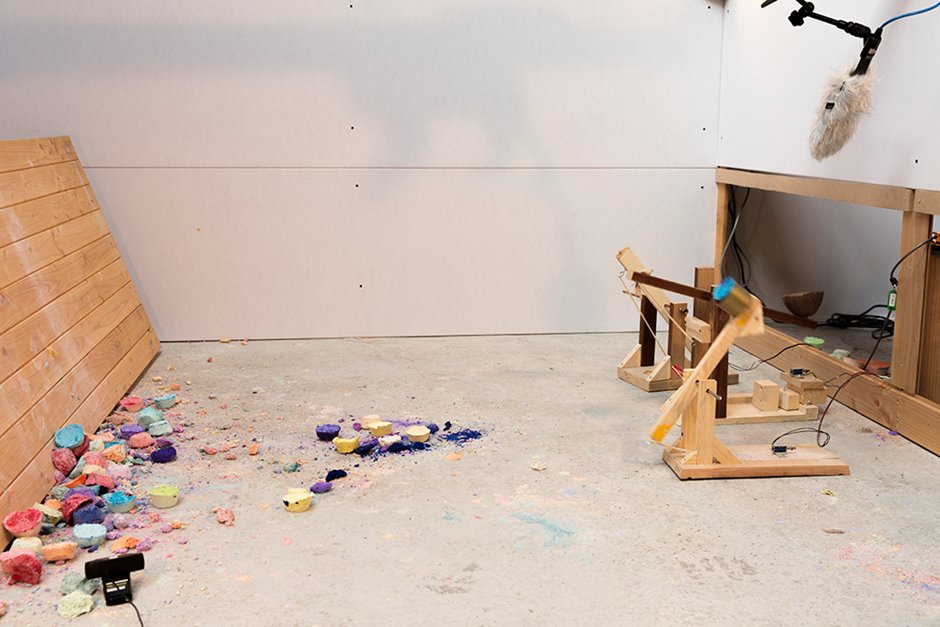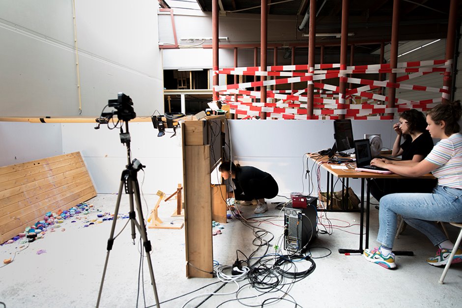 In COLLABORATION #… wordt de deelnemer uitgenodigd om onderdeel te worden van een kunstwerk. Dit doen ze door samen te werken met het systeem. Deze samenwerking gebeurt via een livestream: door te chatten met de host leren de deelnemers de regelset van het systeem en kunnen hier vervolgens mee gaan spelen. Het systeem lijkt te bestaan uit semi-geautomatiseerde katapulten waar de deelnemers projectielen mee kunnen afschieten. Stap voor stap verschuift de focus echter naar de transformatie van het materiaal waarmee zij aan het schieten zijn. Ieder projectiel (object- nee, ding) reageert op zijn eigen manier op de onvermijdelijke impact. Door deze transformatie in beeld te brengen hoop ik (een glimp van) de blik die ikzelf tijdens het proces van dit project heb ontwikkeld met de deelnemer te delen. Een blik die meer waarde is gaan hechten aan objecten en materialen die op het eerste oog waardeloos lijken. Een blik die de identiteit en schoonheid is gaan erkennen van dergelijke objecten en materialen.