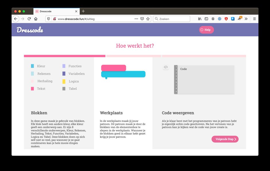 Dresscode richt zich op meisjes tussen de 8 en 12 jaar. Het doel van het spel is meisjes kennis laten maken met coderen. Tijdens het spel maken zij patronen op hun kleding en kunnen deze via een modeshow laten zien. Ze kunnen ook afbeeldingen maken van hun creatie om deze later evt. te delen.