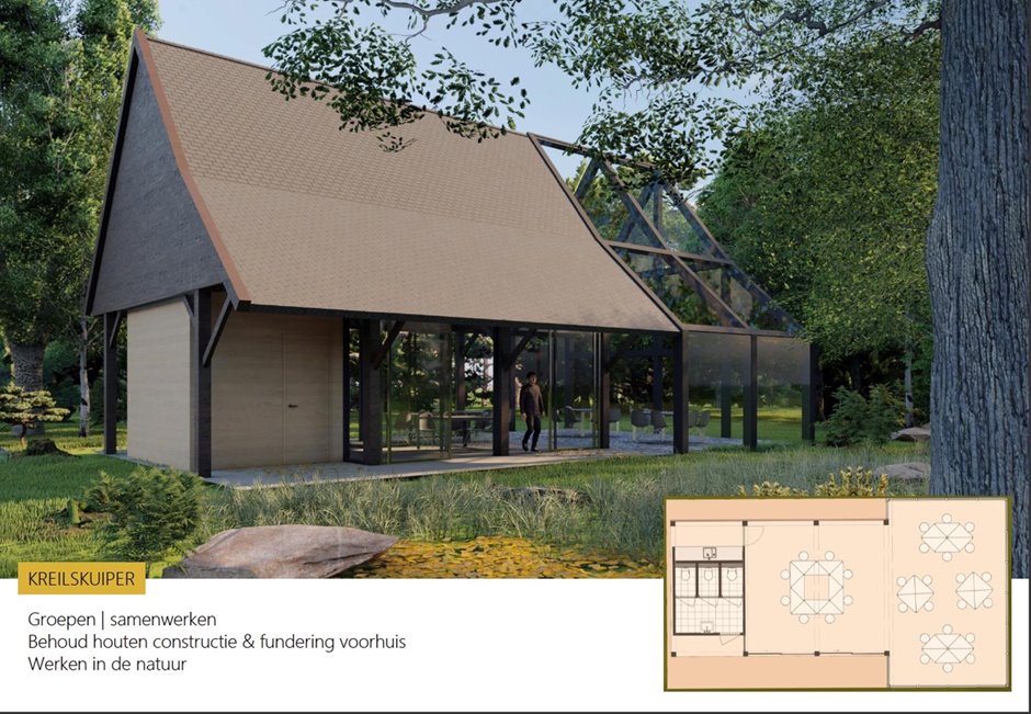 Ik heb verschillende toekomstscenario’s onderzocht en daarvan één scenario uitgewerkt voor landgoed ’t Kreil in Miste. Dit landgoed is een voorbeeld van Vrijgekomen Agrarische bebouwing. Bij het ontwerp maak ik gebruik van de unieke waardes die het gebied heeft, zoals het monumentale karakter, de bijzondere bodemgesteldheid, rust en Achterhoek Argo-innovatieregio. Dit alles vormt de basis voor een karakteristieke werkplek in de natuur. Deze werkplek richt zich op de jonge hoogopgeleide innovatieve werkers. Op ’t Kreil kunnen ze met ‘de voeten in de klei’ werken, om vervolgens het laboratorium of de innovatiewerkplaats in te duiken. Het is een plek om te ontmoeten, te inspireren en te innoveren.