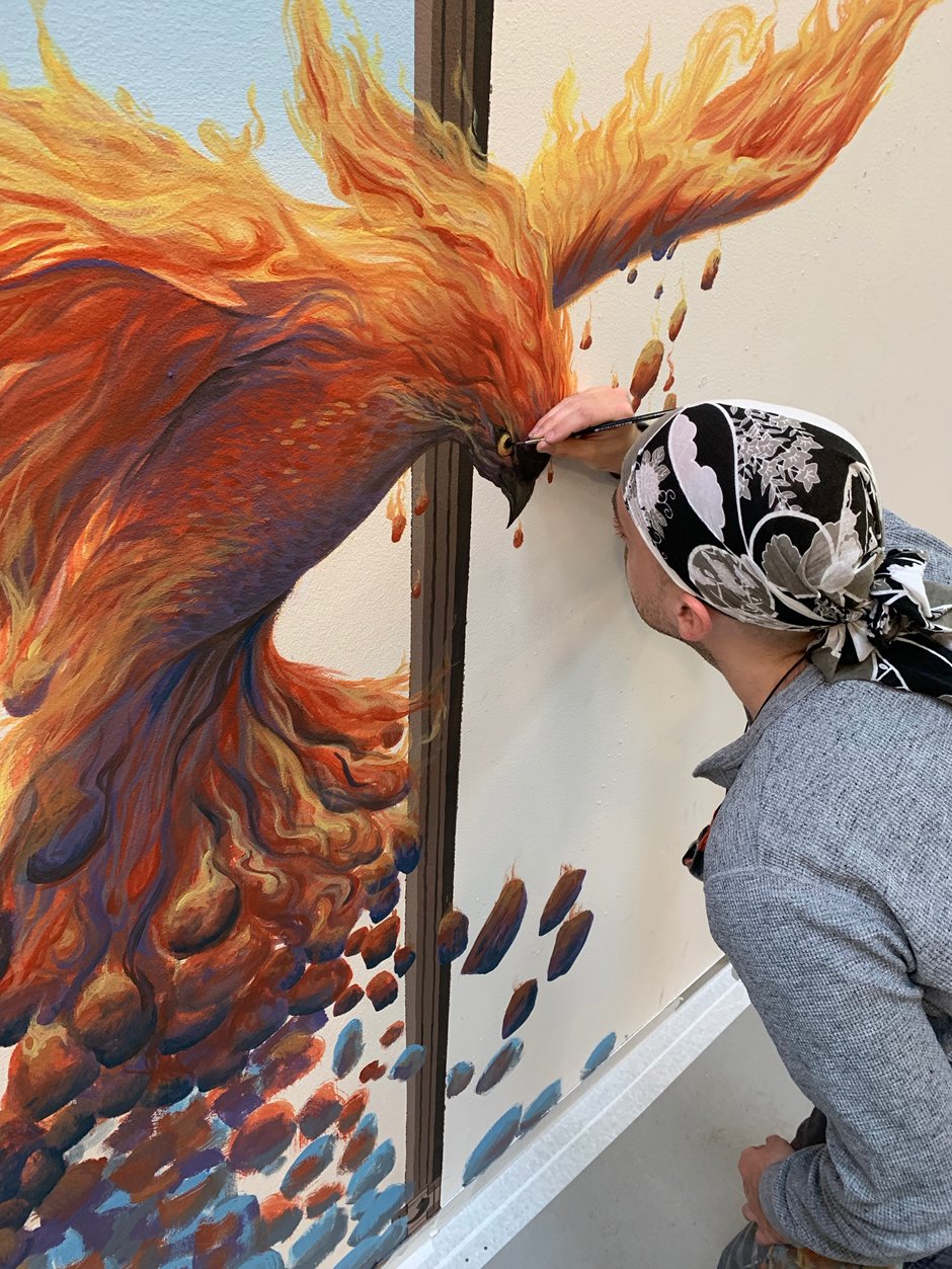 Sjoerd schilderde een Fenix die uit de as herrijst, als symbool voor een nieuwe start na een periode van tegenslag. Sjoerd: ‘Ik had opstartproblemen tijdens mijn studie. Door nekklachten moest ik bijna stoppen en daarnaast had ik moeite om mijn draai te vinden. Dat ik nu, drie jaar na het behalen van mijn diploma, zo’n prominente mural mag maken vind ik héél gaaf. Ik hoop dat het werk een inspiratie vormt voor andere studenten die moeite hebben om hun plek te vinden en zich om die reden soms zorgen over de toekomst maken. Blijf maken, geef niet op!’