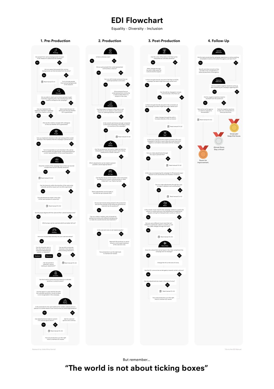 De EDI Flowchart is een diversiteitschecklist in de vorm van een stroomdiagram met vragen in een ja/nee-structuur. Door het aanwakkeren van bewustwording bij de medewerkers van reclamebureaus door het stellen van de juiste vragen, worden zij ondersteund in het maken van de op dat moment meest veilige keuzes op het gebied van diversiteit, inclusiviteit en representatie. Door het gebruiken van de EDI Flowchart wordt aan het begin van het productieproces in de pre-productiefase tot het eind in de post-productie en follow-upfase, rekening gehouden met het waarborgen van diversiteit, inclusiviteit en representatie, en het voorkomen van tokenisme, stereotypering en backlash. Door middel van de EDI Flowchart wordt er tijdens het produceren van een reclame een diversiteitschecklist bijgehouden om er zeker van te zijn dat er oprechte diversiteit wordt gewaarborgd. Dit resulteert in een reclame die idealiter vrij is van tokenisme en vol van diversiteit.