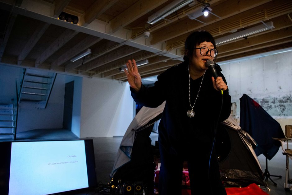 The work centers on four narratives, a fictional story, a real-life incident, a set of looping conversations and a karaoke party, which were collected at different moments during M.C. Julie Yu’s stay in Europe. The works are set in relation to a tourist tent, which signifies a life in movement. As the viewer faces a dilemma—do they enter the tent or not?—, their wondering reveals the work’s core question: while constantly moving in-between worlds, how do we position ourselves in terms of belonging? The show will take place at bak Utrecht, from 30 Sep to 11 Oct 2020