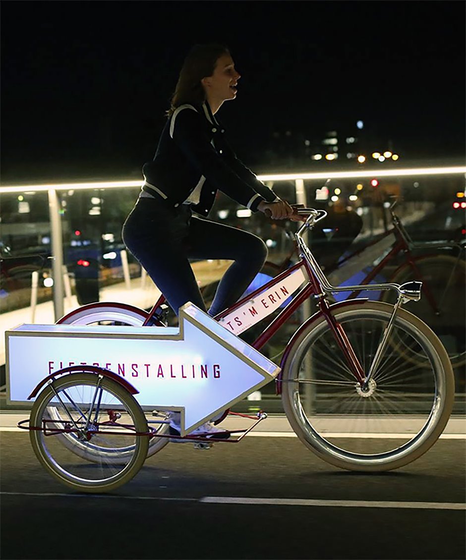 ‘Kunstenaar Max Rorink heeft in september 2017 Fiets ‘m erin gewonnen. Hij ontwierp een zijspanfiets met neonpijl. Daarmee fietste hij door de stad om aandacht te vragen voor fietsenstallingen. Ook installeerde hij projectoren die op de weg schenen om de fietsenstallingen zichtbaarder te maken.’