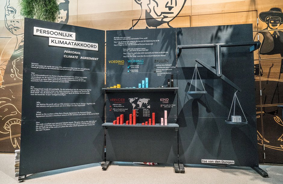 ‘Een ander project waarbij ik betrokken ben is ‘Het Persoonlijk Klimaatakkoord’, een interatieve installatie gemaakt door mijn collega Ilse van den Dungen. Deze weegschaal maakt een vertaling van het Klimaatakkoord van Parijs naar individueel niveau in Nederland. Aan de linkerkant hangt een blok dat symbool staat voor de maximale CO2-uitstoot voor de komende twaalf jaar; aan de rechterkant plaats je blokjes die jouw persoonlijke acties vertegenwoordigen. Denk aan consumptie, reizen en kinderen. Door het wisselen van blokjes zie je hoe een veranderende levensstijl zorgt voor het behalen van je persoonlijke klimaatdoel. Ik help Ilse met de berekeningen van een nieuwe versie van de installatie. Daarnaast ga ik samen met Ilse naar plekken waar de installatie tentoongesteld wordt. De reacties van de mensen zijn bijzonder. Het laat me zien hoe krachtig kunst kan zijn bij het tastbaar maken van het klimaatprobleem.’