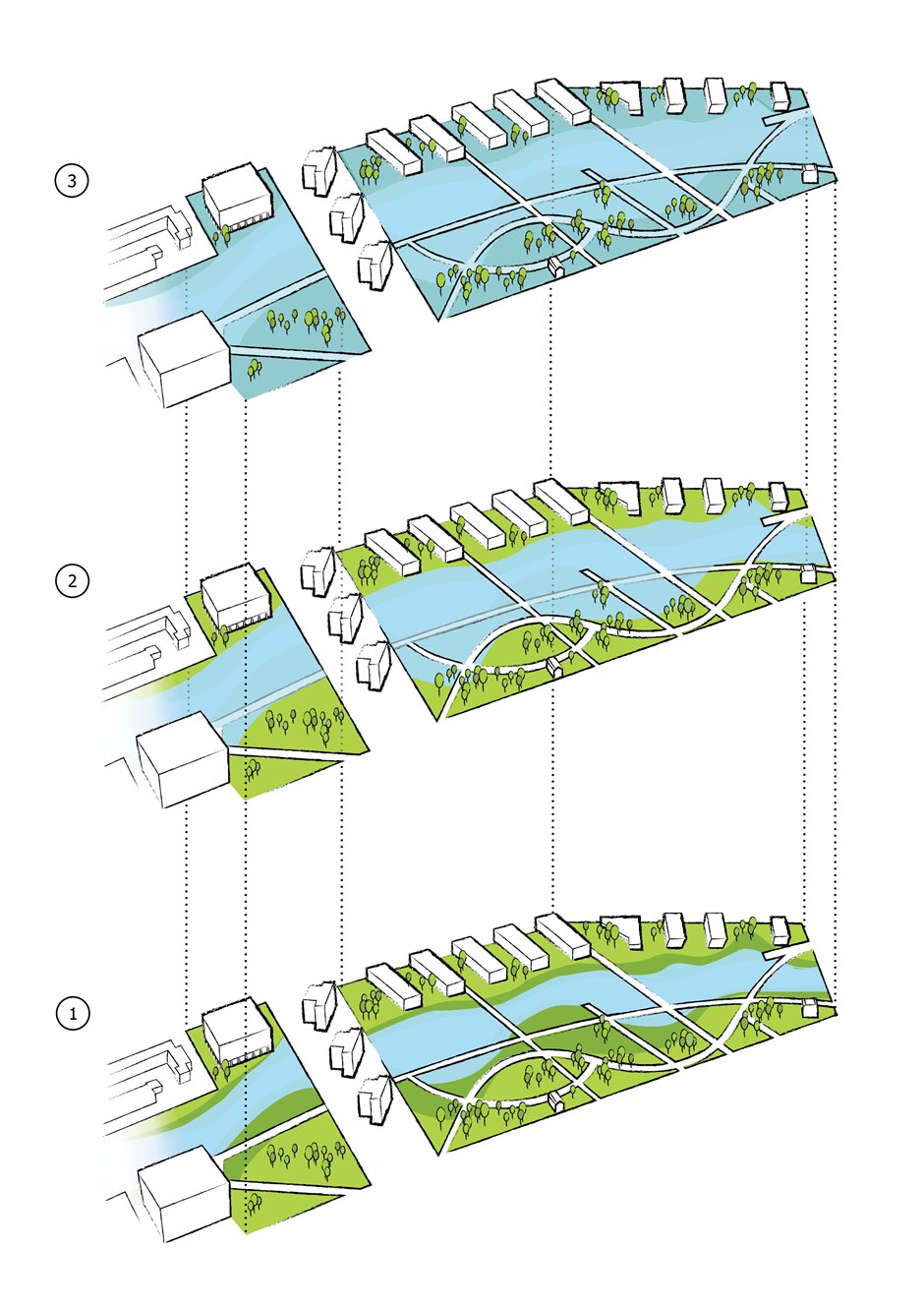 Het getijdenpark zou in de Nassau- en Persoonshaven van Feijenoord komen. Dit is niet bepaald het rijkste stadsdeel van Rotterdam; er staan veel sociale huurwoningen. Maar waar in veel stedenbouwkundige plannen huurhuizen plaats moeten maken voor koopwoningen, blijft in Ambers plan het sociale karakter van de wijk gehandhaafd. ‘In mijn ontwerp wordt niets gesloopt. De buurthuizen worden verplaatst naar betere plekken en in het getijdenpark komen enkele locaties waar nieuwbouw gepleegd kan worden. Feijenoord is inderdaad niet de beste wijk van de stad. Dat heeft ermee te maken dat het vroeger een levendig havengebied was met huisvesting voor de arbeiders. Nu is die industrie verdwenen en liggen de havenbekkens en bijbehorende gebouwen er ongebruikt bij. De vorm van deze gebouwen en havens zijn misschien hetzelfde gebleven, de functie bestaat niet meer. Dat verslechtert het imago van de wijk. In mijn plan worden de havenbekkens met elkaar verbonden, zodat het water weer vrij kan stromen: daar ontstaat het getijdenpark. Verder heb ik een monumentenroute ontworpen waarbij belangrijke gebouwen zoals de Hefbrug, de Unileverfabriek en de oude scheepshelling weer een prominente plek in de buurt krijgen.’