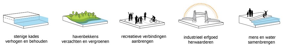 Maar wie is er dapper genoeg om, in tijden van klimaatverandering, in een getijdengebied te gaan wonen? ‘Ik begrijp er eerlijk gezegd niets van dat mensen nu niet bang zijn. Feijenoord is, net als de hele randstad, één grote badkuip: er hoeft maar één dijk te bezwijken en het hele gebied loopt onder water. We moeten ons afvragen of dijken altijd de beste oplossing zijn. Uit onderzoek is bovendien gebleken dat, door het uitblijven van grote overstromingen, het waterbewustzijn van de Nederlanders enorm is afgenomen. Zodra we water op straat zien, raken we haast in paniek. We moeten juist inzien dat water, dat zich een weg zoekt door de straten, een goed teken is. Het is zichtbaar water, het is water dat zijn weg wel vindt. Gevaarlijke situaties ontstaan juist wanneer wij het water geen ruimte geven, wanneer het water zich kan opstapelen achter de dijken. Ik denk dat er een belangrijke mentaliteitsomslag moet plaatsvinden. We moeten weer wennen aan het water en er veilig mee om leren gaan. Wonen in een getijdengebied kan die omslag juist bewerkstelligen, want kom op! Wij zijn Nederlanders: wij leven van en met het water.’