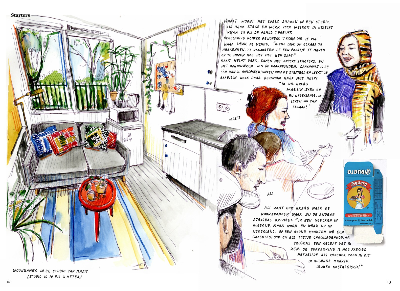 ‘Dat is vrij geleidelijk gegaan. Toen ik afstudeerde in Illustratie was ik al bezig met getekende journalistiek. Daar heb ik toen een workshop gegeven in een voormalig zorghuis waar jongeren en ouderen bij elkaar wonen – waar ik sindsdien overigens zelf ook woon. De workshop was geen tekenles, maar diende puur als middel om met elkaar in contact te komen. Het werd gesubsidieerd door cultuurplatform ZIMIHC en The Social Collective, die ook weer betrokken waren bij deze asielbuurtcentra. Zij hebben mij toen in contact gebracht met het team van Plan Einstein.’