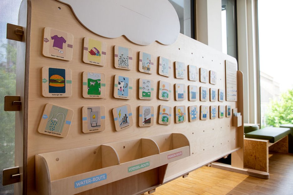 Uiteindelijk ontwierp Daniels de Klimaatmuur: een grote houten installatie met puzzelstukjes die drie thema’s in kaart brengen: water en energie, voedsel, en fashion. ‘Ik heb van deze thema’s de klimaatroutes in beeld gebracht. Zo’n route is een puzzel die kinderen in de juiste volgorde van oorzaak en gevolg moeten leggen. Of ik een voorbeeld kan geven? Wanneer ze een hamburger eten, zijn daarvoor koeien nodig. Koeien laten scheten, die de lucht ingaan en voor een stijging van broeikasgassen zorgen. Die gassen worden opgenomen door zeewater, dat hierdoor zuurder wordt. En door deze verzuring sterven algen, plankton en koraal, waardoor er door voedseltekort weer andere zeedieren uitsterven.’
