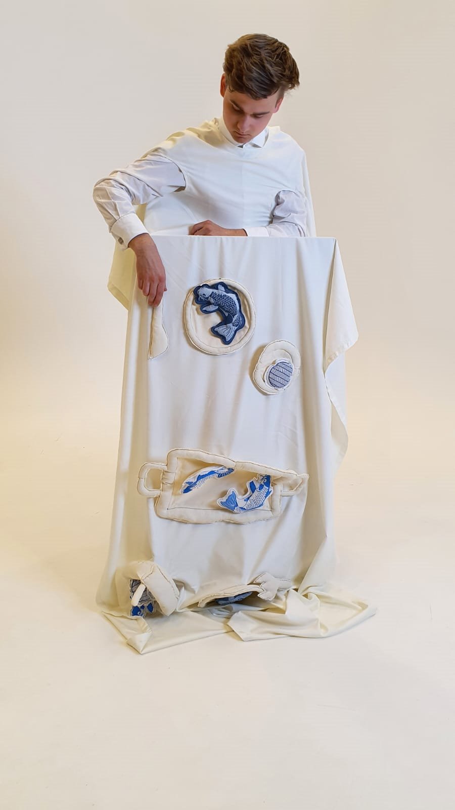 Kleding, een voorstelling, een illustratie; Chiems werk komt in allerlei gedaanten. In een tafelkleed dat hij in het voorjaar ontwierp verwerkte hij armgaten, zodat het draagbaar werd en hij het kleed daarmee van tafel kon trekken. ‘Tot dan toe was mijn werk strak en statig; voor het eerst zat er nu een soort humor in. Ik zie het ook meer als één geheel, doordat ik het zelf heb ontworpen, geproduceerd en gedragen. Ik heb bij het maken echt veel plezier gehad, het ging als het ware vanzelf.’