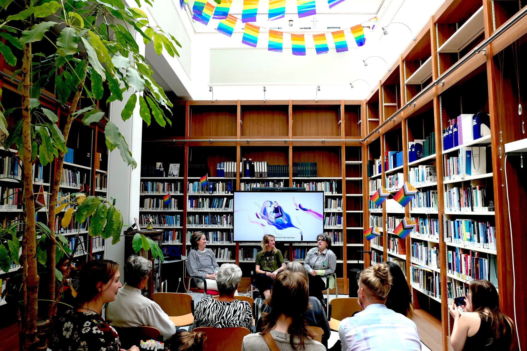 Vervolgens vertoonde Iris Pontoni, HKU-alumna, haar korte animatiefilm over haar twee moeders en hun zoektocht in de jaren negentig naar iemand die hun kinderwens kon helpen vervullen – een ode aan queer families en gekozen ouderschap. Hierover ging ze in gesprek met HKU-lector Fabiola Camuti en UvH-promovendus Annemijn van der Schaar (foto). Niet alleen over juridische obstakels en heteronormatieve vragen als “Waarom heb je geen vader?”, maar juist over queer joy, zoals opgroeien zonder gegenderde normen en verwachtingen.
