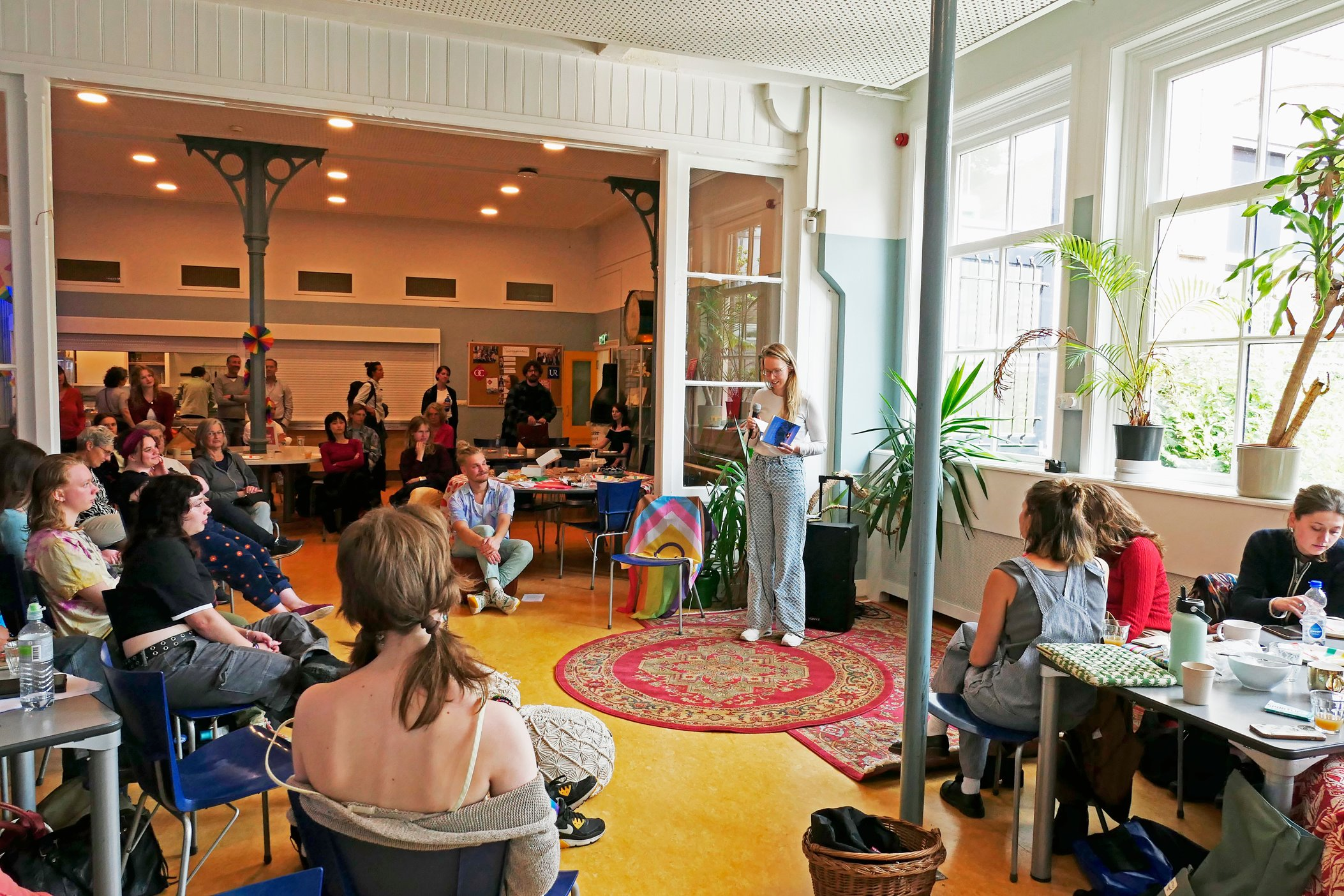 De middag begon met optredens van drie UvH-kunstenaars: Samira van der Loo (foto), Leo van den Bemt en Rana Nazari. Hun poëzie, spoken word en verhalen boden ruimte voor verwarring, kwetsbaarheid en verzet; van de vraag “Wie ben ik als ik alle genderverwachtingen loslaat?” tot een ode aan queer liefde tussen vrouwen en het belang van allyship.
