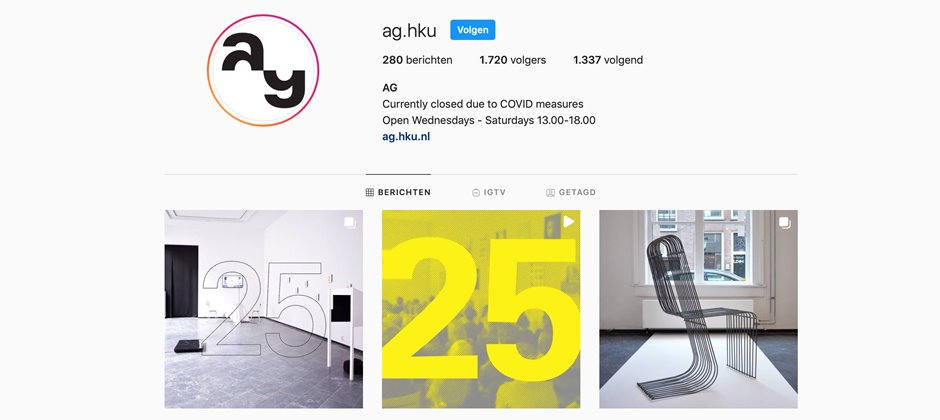 AG, de tentoonstellingsruimte van HKU, bestaat deze maand 25 jaar! Om dit te vieren kun je op hun Instagram en Facebookpagina vanaf vandaag 25 dagen lang een selectie uit de exposities van de afgelopen 25 jaar bekijken.