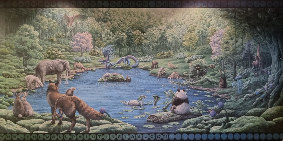 Groneschild kreeg de opdracht om verschillende dieren bij een meer in een bos bij elkaar te laten komen. Dat inspireerde hem tot het schilderen van niet alleen bestaande dieren, maar ook fantasiewezens. Hij bedacht onder meer een zeedraak en een drinkende boom. Als kijker kun je helemaal opgaan in de wereld die hij heeft gecreëerd. Dat vindt de maker zelf ook een van de mooiste eigenschappen van het werk. ‘Elke keer als je het ziet, ontdek je iets nieuws’.