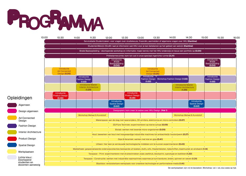 Bekijk hieronder het Open Dag programma van HKU Design. De Open Dag vindt plaats van 10:00 - 16:00 uur op Ina Boudier-Bakkerlaan 50 in Utrecht.Workshops en demonstraties in de werkplaatsen