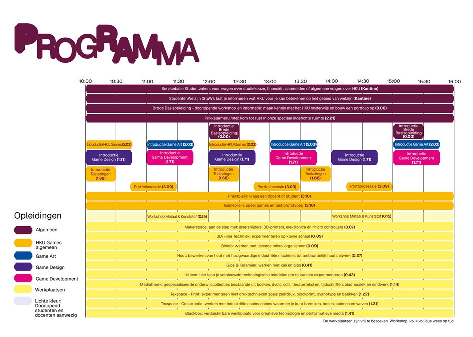 Bekijk hieronder het Open Dag programma van HKU Games. De Open Dag vindt plaats van 10:00 - 16:00 uur op Ina Boudier-Bakkerlaan 50 in Utrecht.